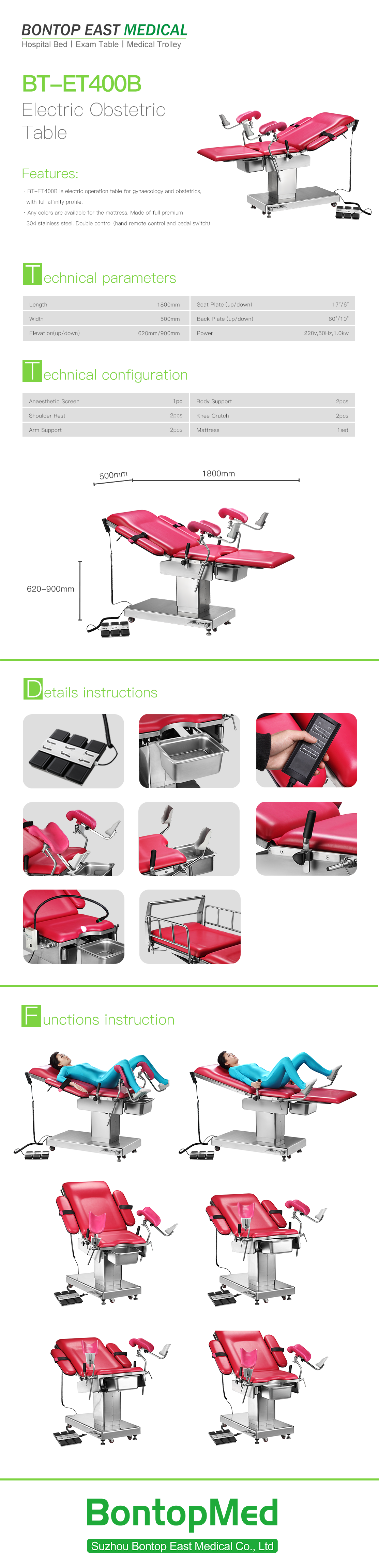 • BT-ET400B is electric operation table for gynaecology and obstetrics. with full affinity profile. Any colors are available for the mattress.Made of full premium 304 stainless steel.Double control(hand remote control and pedal switch).