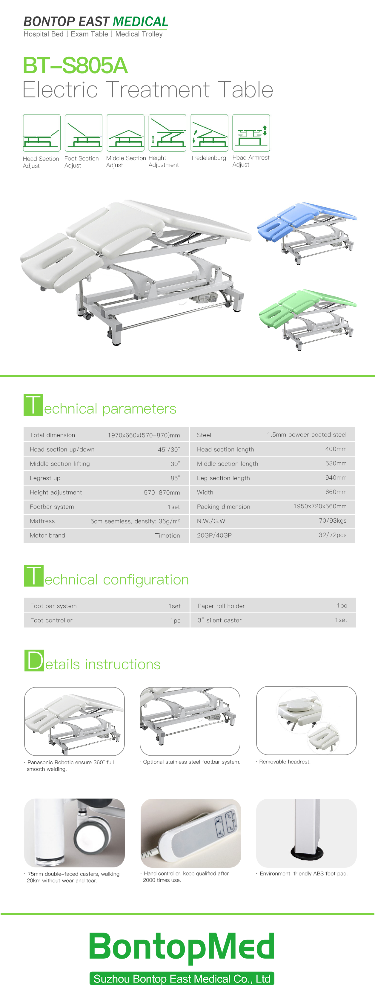 | • Multi function of massage, beauty, tattoo • PU surface mattress with optional upholstery(6 cm polyurethane sponge,10 cm manual sponge) • 1.5 mm thickness powder coated steel structure • High quality Virgin ABS material • Optional stainless steel footbar system • The robot welds without scar,standardize laser cutting • CE approved noiseless motor • Optional hand or foot control • Dimension: 1970 x 690 x (530-970) mm Functions: • Head section up/down: 10°/85° • Leg section up/down: 80°/0° • Waist section up/down: 30°/0° • Height adjustment: 530-970 mm • Bear loading: 150 kg. Accessories: • Pillow: 1 pc. • Arm support: 2 pcs. • Waist support: 2 pcs. • CE approved motor: 2 pcs. (if change to Jiechang or Timotion, 300 RMB need to be added for a motor). • Gas spring: 2 pcs. • 4 inch casters: 4 pcs. • Hand controller: 1 pc. • Paper roll holder: 1 pc. Optional accessories: • Footbar system: 1 set 575 RMB • Packing: 200 x 70 x 55 cm • G.W.: 93 kg. • Warranty:12 months ![]() |