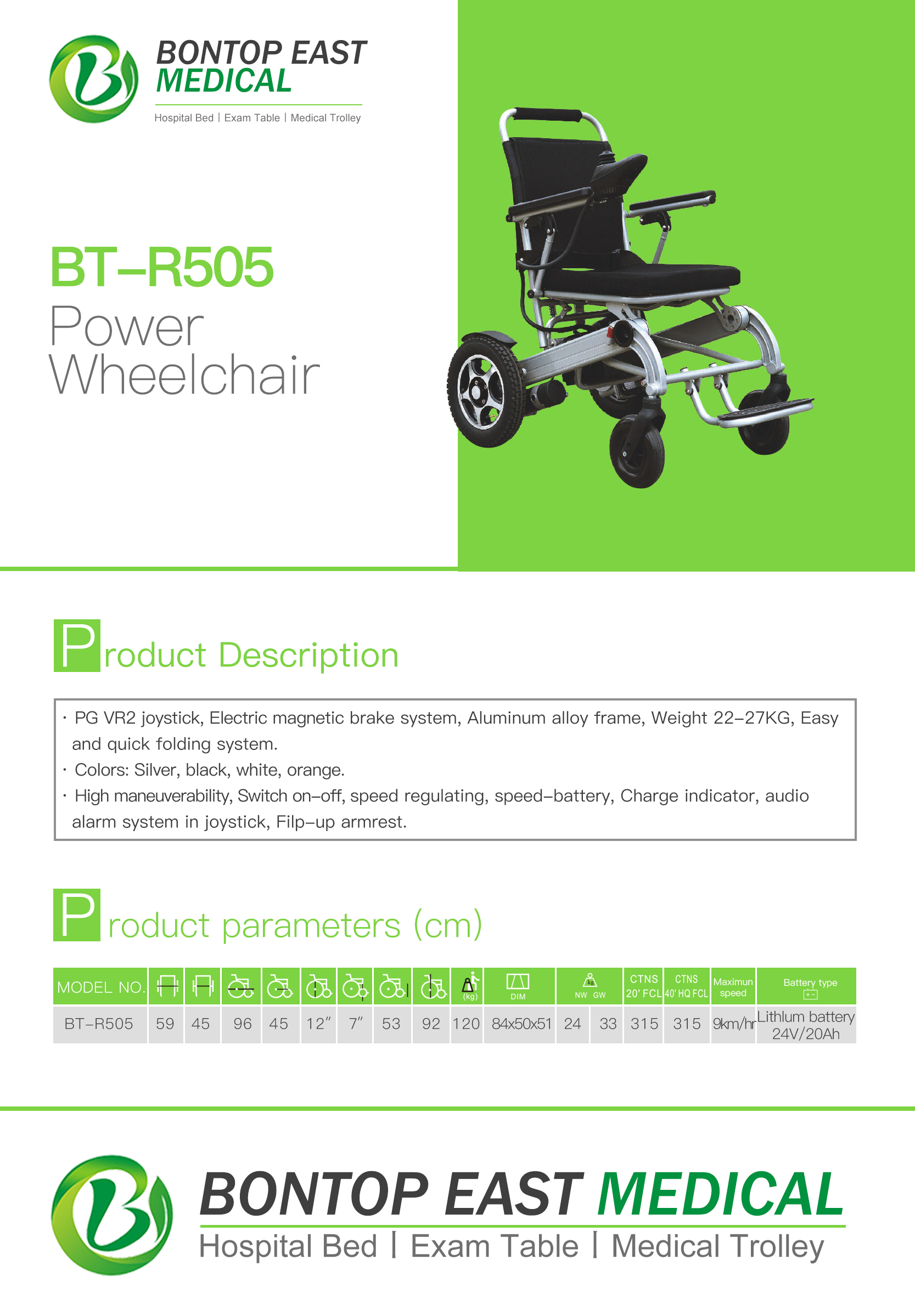 | Technical Configuration | 1. PG VR2 joystick 2. Electric magnetic brake system 3. Aluminum alloy frame,weight 22-27KG 4. Easy and quick folding system 5. Colors:Silver,Black,White,Orange 6. High maneuverability 7. Switch on-off,speed regulating,speed-battery 8. Charge indicator,audio alarm system in joystick 9. Flip-up armrest |