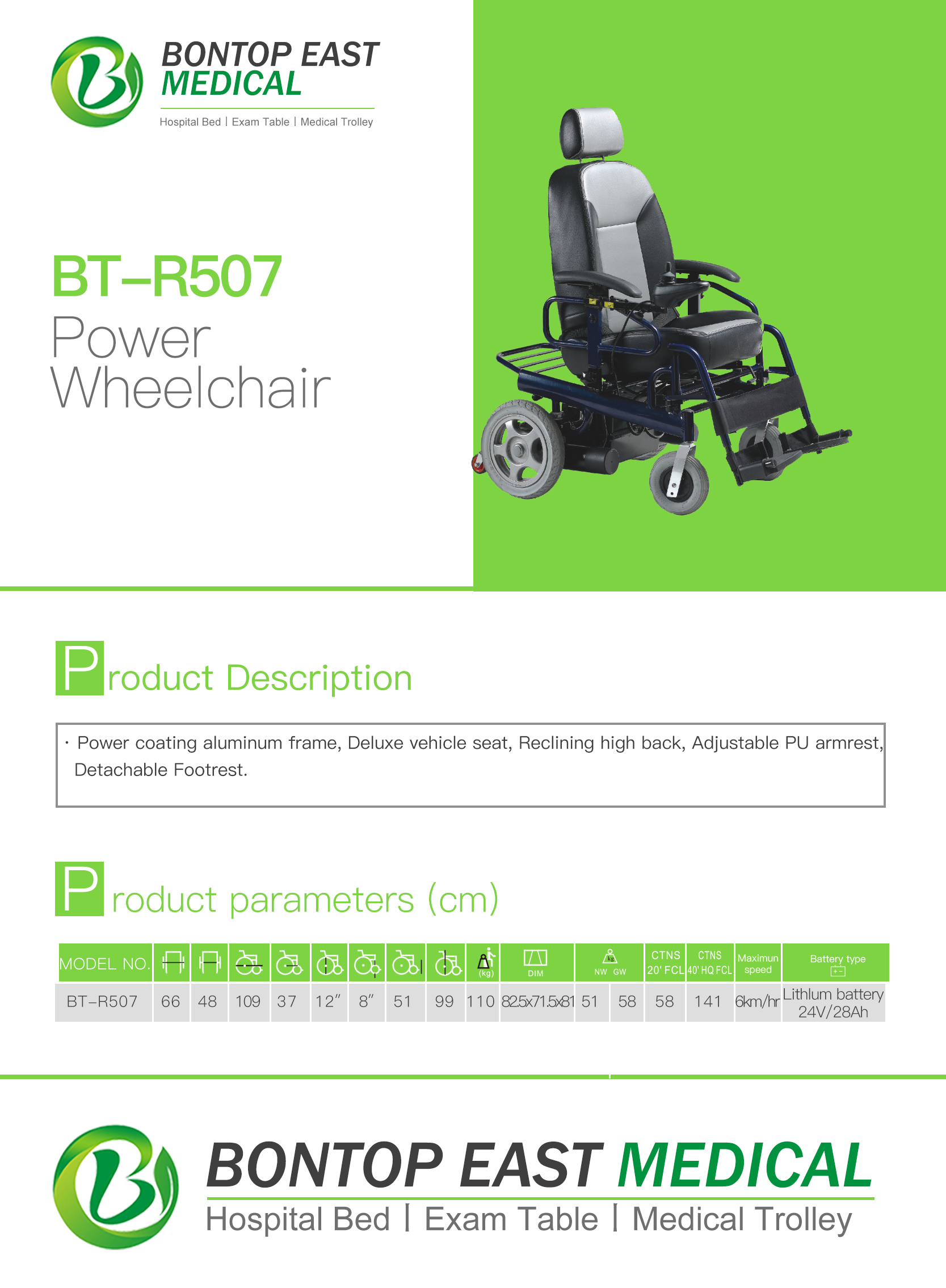 | Technical Configuration | 1. Powder coating aluminum frame 2. Deluxe vehicle seat 3. Reclining high back 4. Adjustable PU armrest 5. Detachable footrest |